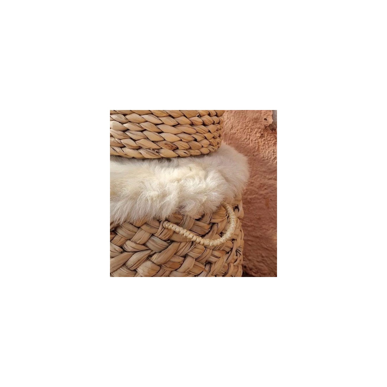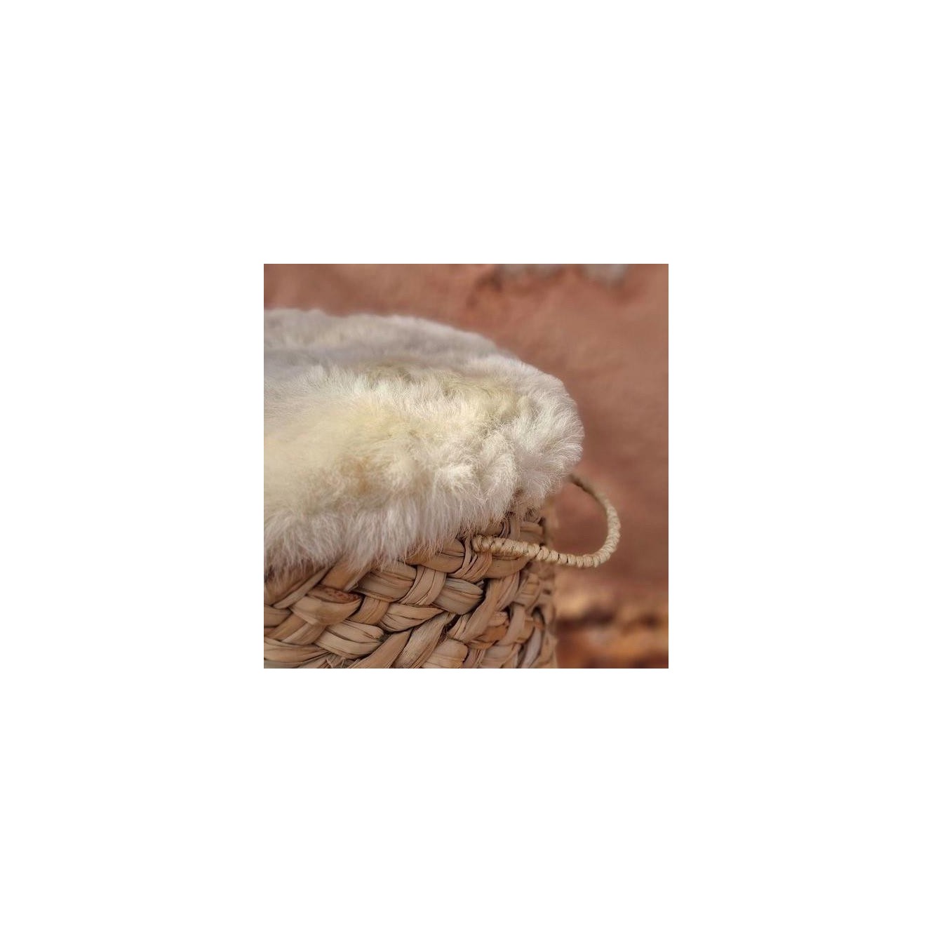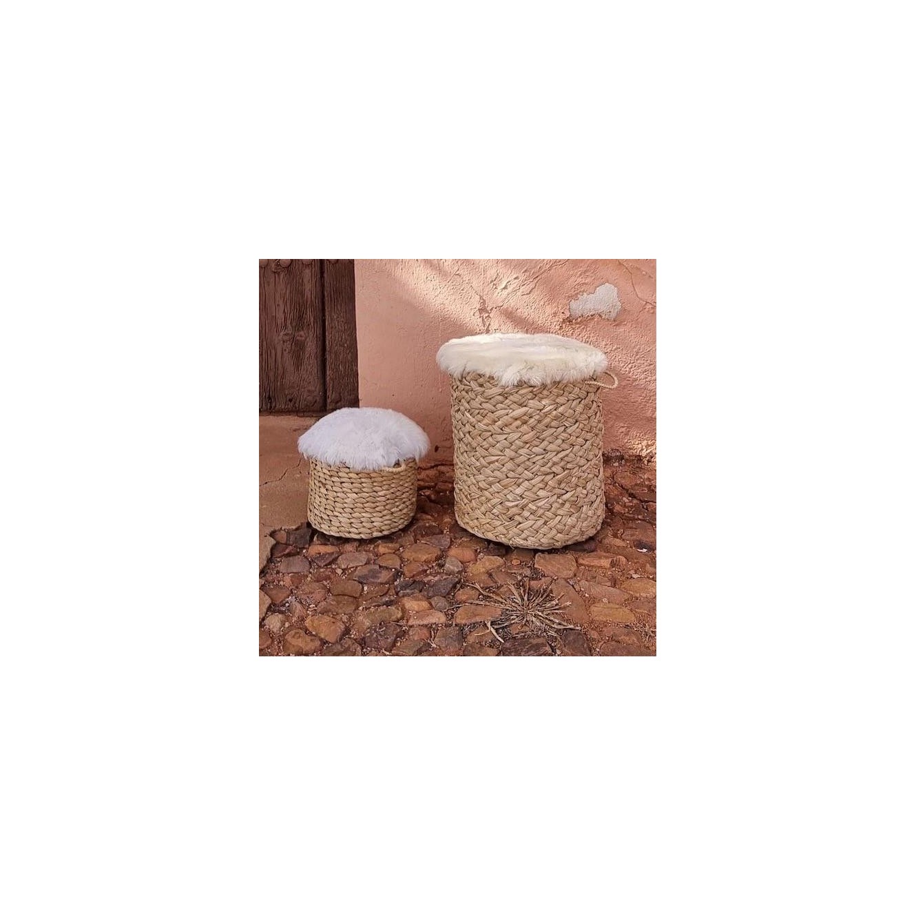 Asiento realizado en soga de esparto circular y sin respaldo, cubierto de pelliza de cabrito.