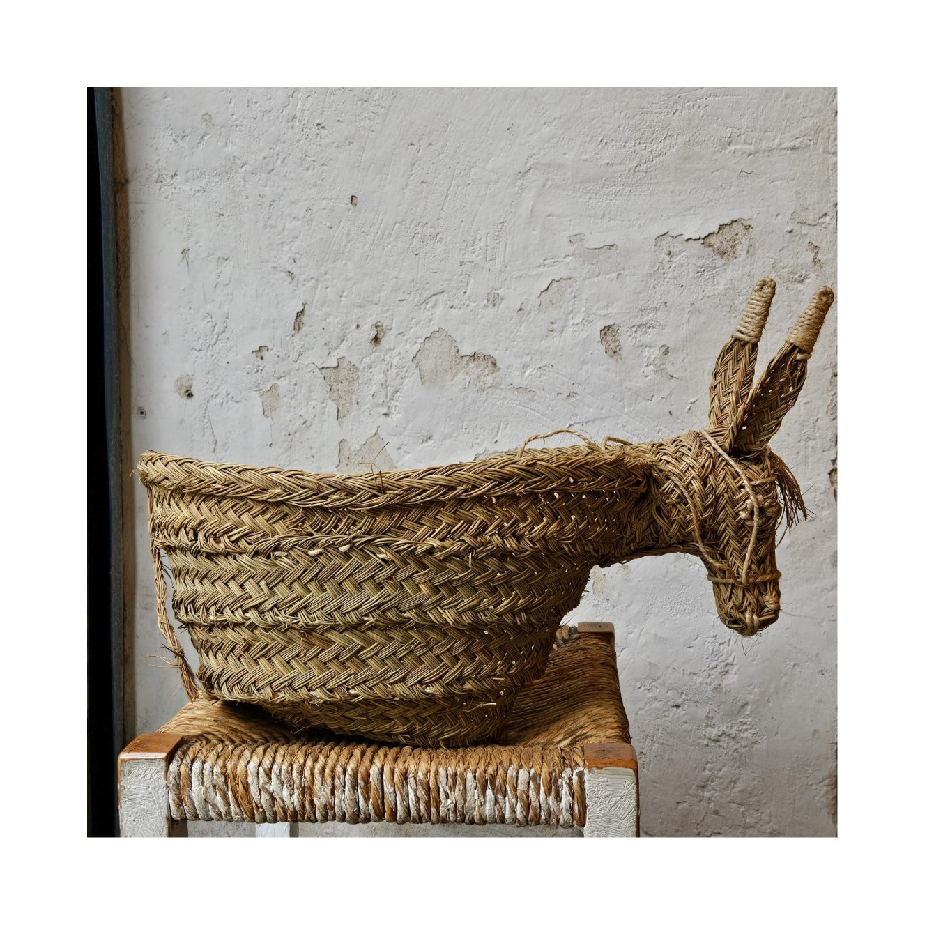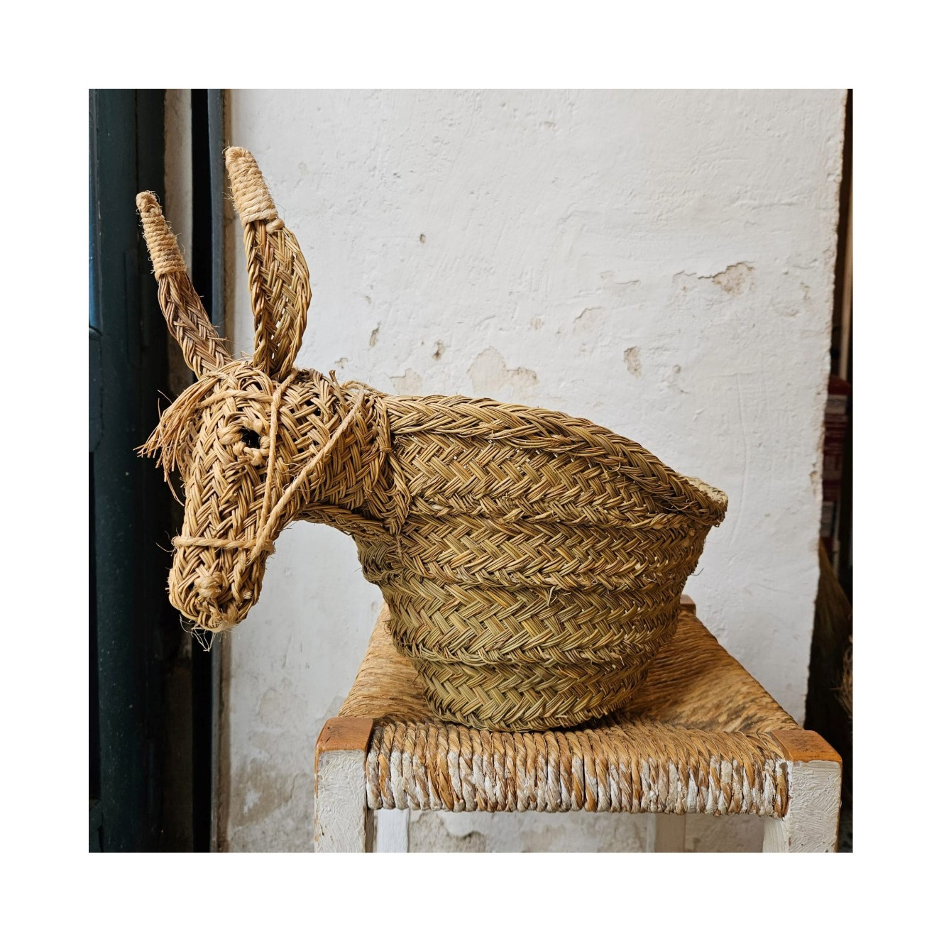 Cesto con detalle de cabeza de burro, realizado en esparto por artesanos de Jaén. Esparto español antiguo.